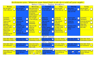 Summer is a great time to train dc their chore routines. One thing I have learned when it comes to chores is that a new chore chart each year - even if it has almost exactly the same chores on it - is always a welcome change. While change is good in the "look" of the chore chart, small changes are better when it comes to who is doing which chores. Real time - as in years - is needed for dc to learn to do chores well in a routine way.